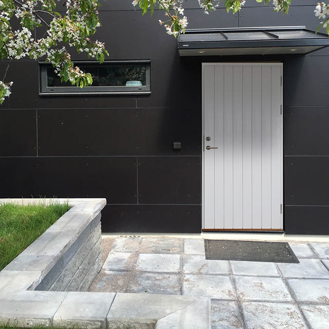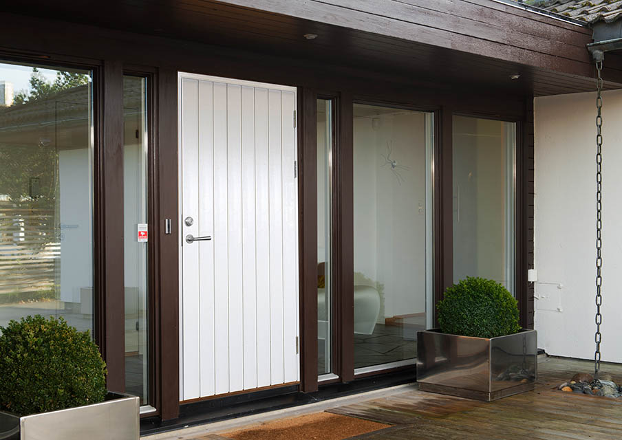 Fjällbacka är en stabil, fullvärdig och mycket prisvärd ytterdörr. Dörren har finsågad granpanel på utsidan, perfekt för stort slitage. En skadad panel går lätt att byta ut. Invändigt har dörren en slät yta av furufanér.